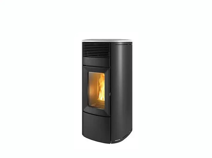 Design-Pelletofen mit Stahlkorpus, Top und Außenseiten aus Keramik White, Matt Black. Brennschale aus Gusseisen. Neues Restyling 2021, das die Ästhetik der Flamme verbessert hat. Dank der Technologie Maestro+, kann der Ofen über eine spezielle App direkt per Smartphone gesteuert werden, welche die vollständige Bedienung des Ofens sowohl aus der Ferne als auch über den Internetanschluss des Hauses (Router) oder direkt per Bluetooth ermöglicht. Serienmäßig erhältlich ist auch eine innovative digitale Bedienblende, die an der Topplatte befestigt und versenkbar ist.