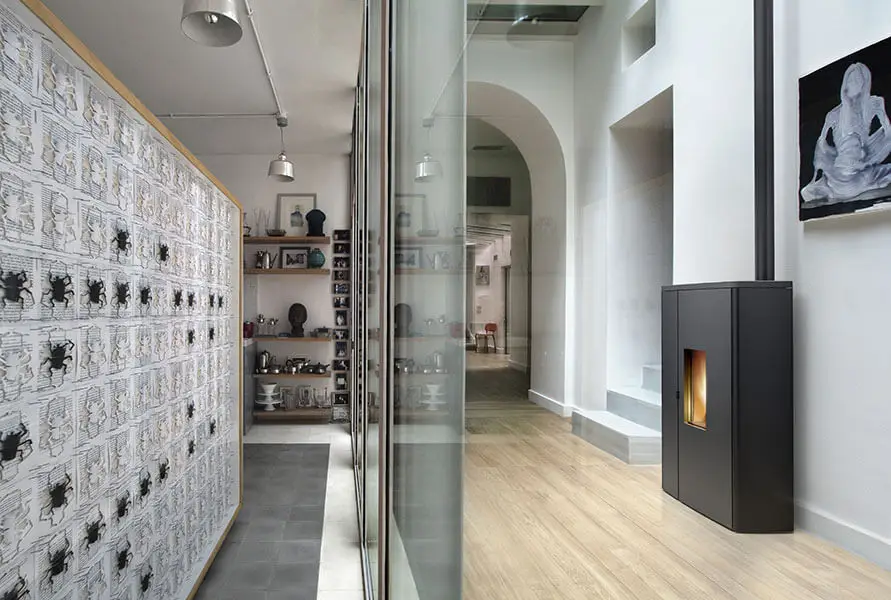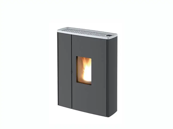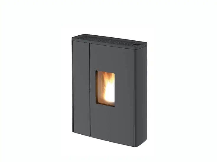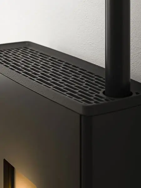 Kanalisierbarer Pelletofen, der, dank der geringen, mit einem Heizkörper vergleichbaren Tiefe von 30 cm, besonders für Flure und Räume mit wenig Platz geeignet ist. Auf der extrem geradlinigen, schwarz lackierten Vorderseite aus Stahl, befindet sich rechts die Feuerstelle und links eine Tür zum Pelletbehälter. Die Abdeckplatte punktet durch ein originelles geometrisches Muster und ist in Gußeisen, schwarz lackiert oder in der Endverarbeitung Aluminium, erhältlich. Mit Rauchabzug an der Rückseite oder auf der Topplatte (Version UP!) erhältlich.