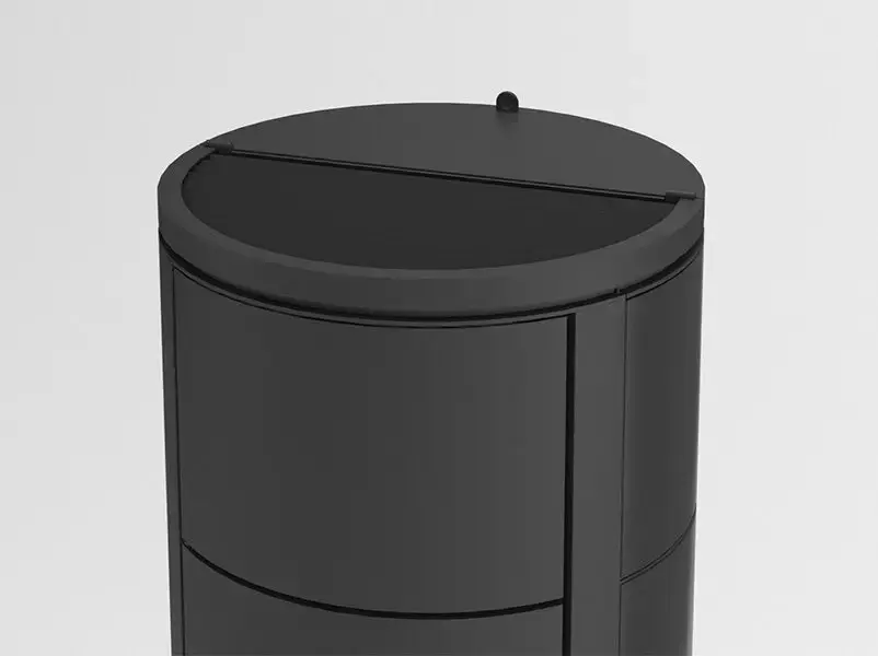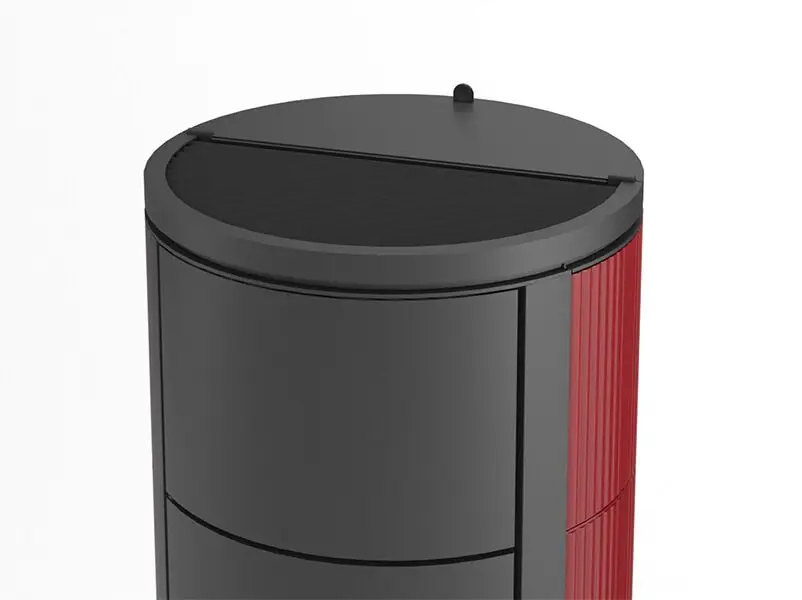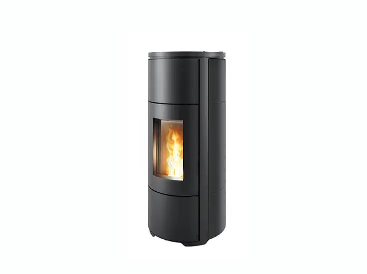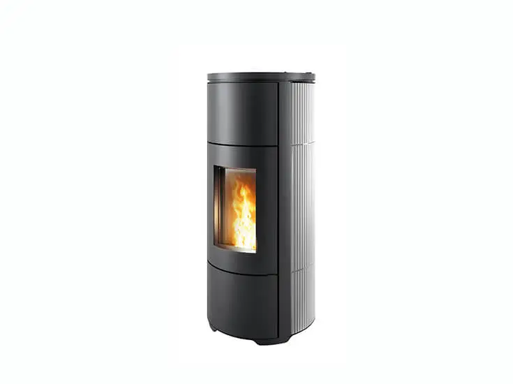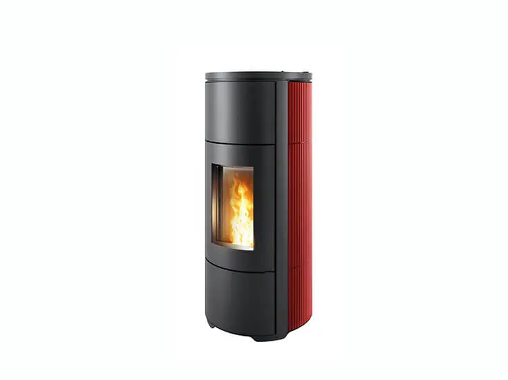 Runder kanalisierbarer Pelletofen mit einer Leistung von 10 kW, mit Struktur aus Stahl und Verkleidung aus Keramik mit glatter (Plain White, Plain Black) oder geriffelter (Line White, Line Bordeaux) Oberfläche.