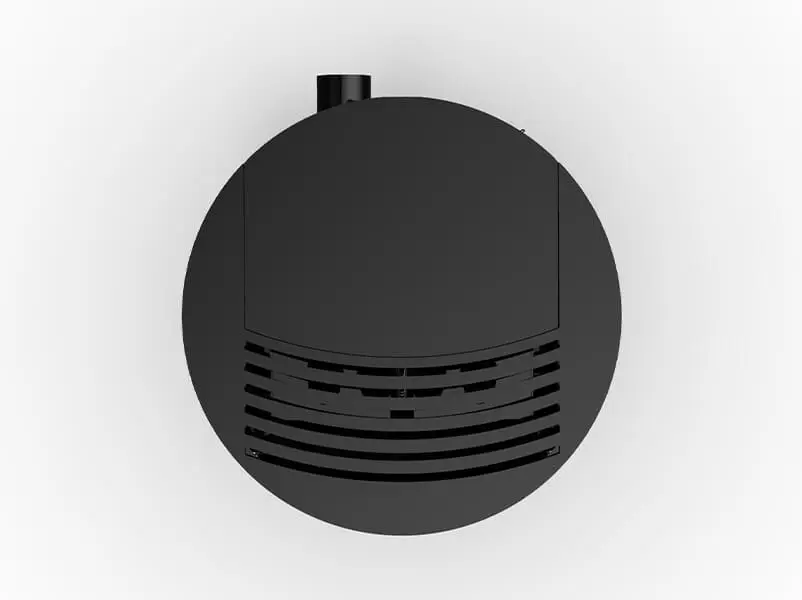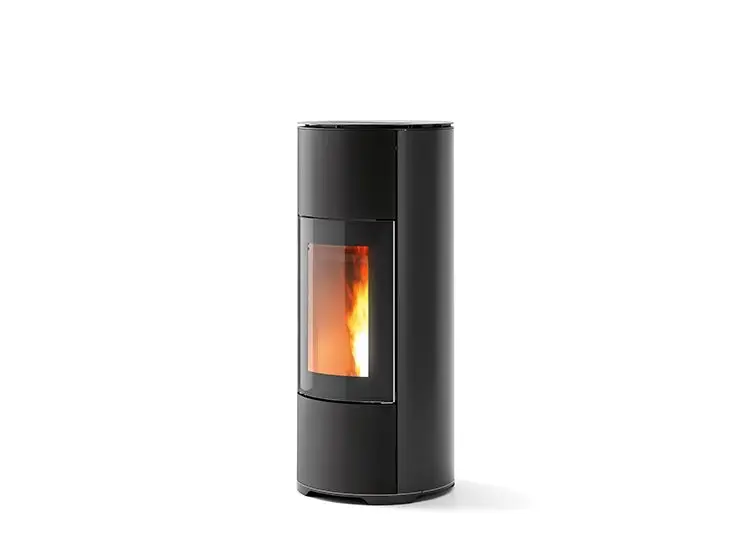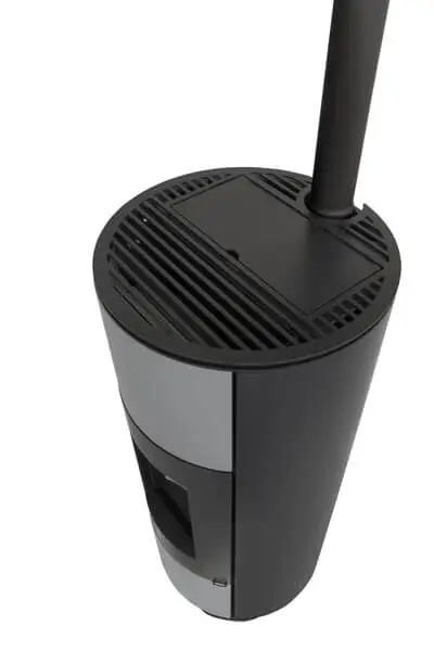 Dieser Pelletofen ist auch in der Version mit Rauchabzug oben statt hinten erhältlich. So ist eine Montage direkt an der Wand möglich; durch die geringere Tiefe des Ofens wird der Wohnraum optimiert.