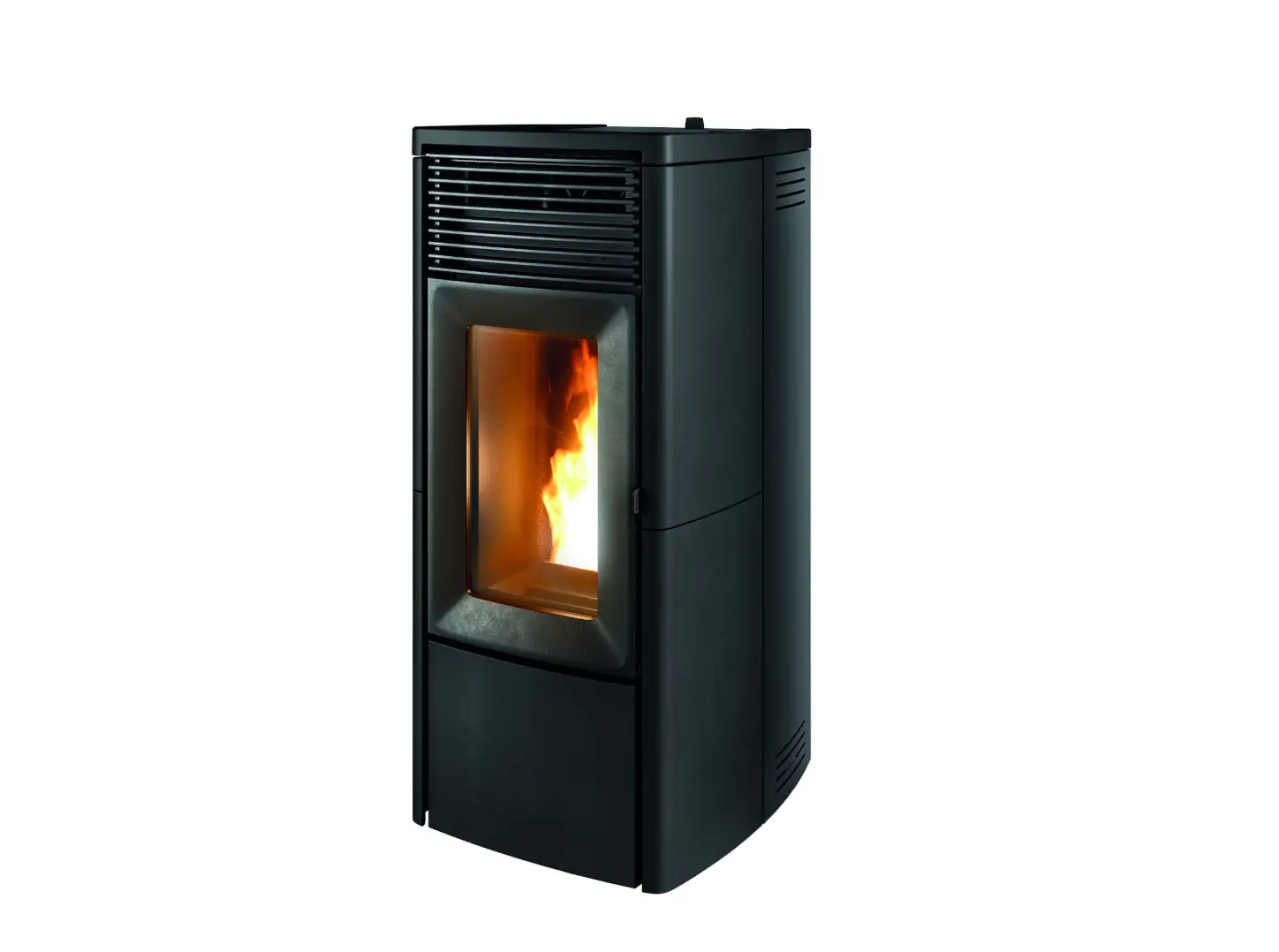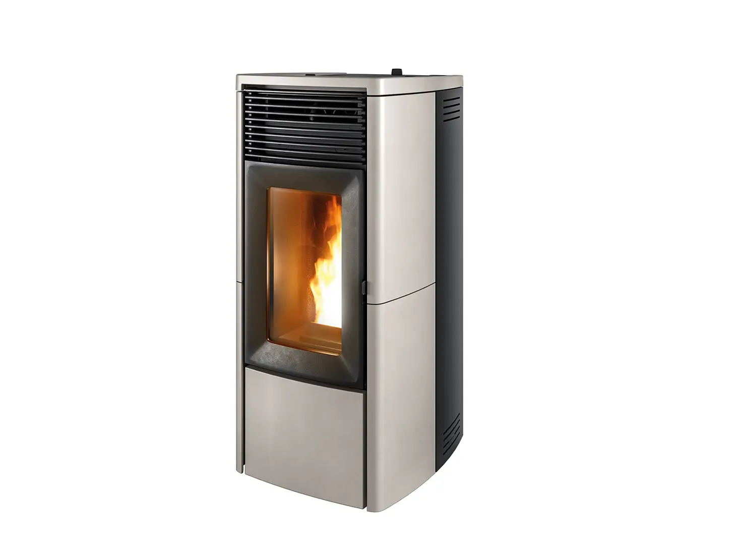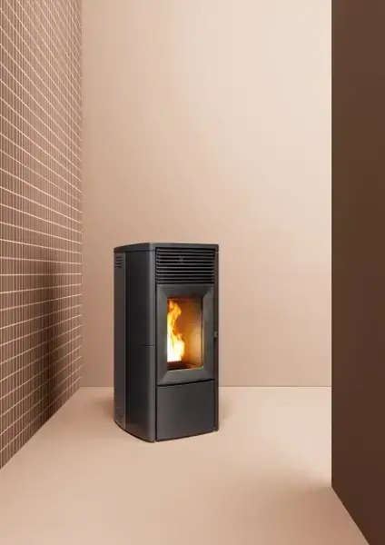 Pelletofen mit Stahlkorpus, Top und Außenseiten aus Keramik. Brennschale aus Gusseisen. Intelligente Regelung der Verbrennung über die Technologie Maestro+.