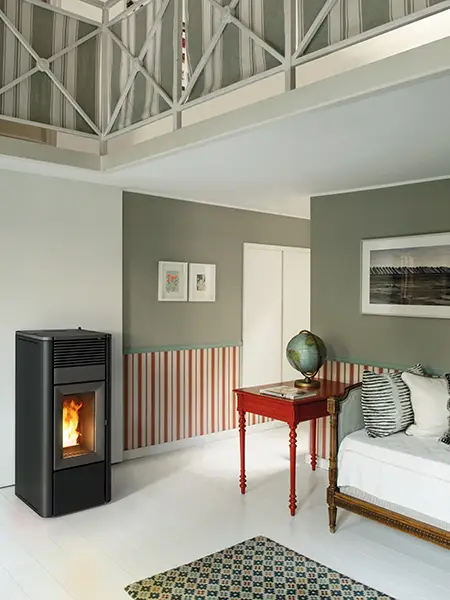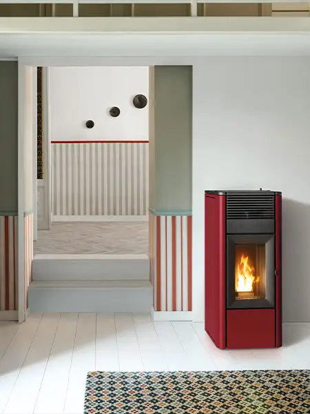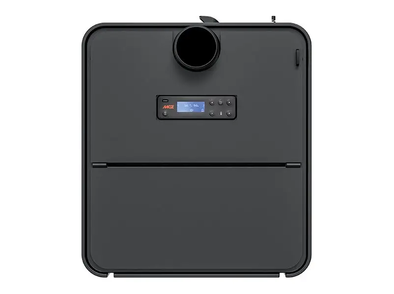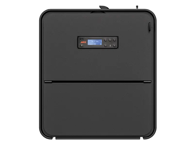 Kanalisierbarer Pelletofen aus Stahl und Gusseisen. Abdeckplatte aus Gusseisen und Seitenwände aus lackiertem Stahl in Bordeaux, White, Dark. Präzise und vereinfachte Kontrolle des (vorderen-hinteren) Luftstroms mittels Regler, der einen elektrischen Stellantrieb auslöst. Er gehört zur Kollektion „Easy“ von MCZ, einer Reihe von Pelletöfen, die mit Standard-Endverarbeitungen und -Elektronik zu einem fairen Preis angeboten werden.